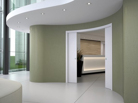 Nadaje wnętrzu harmonię i elegancję. Specjalnie skonstruowane wózki z jednym kółkiem pozwalają na swobodny ruch drzwi po prowadnicy w kształcie łuku.