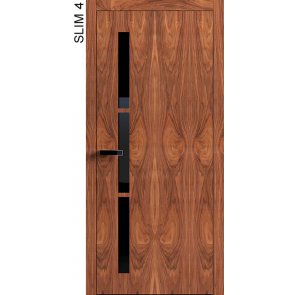 Kolekcja SLIM – Model SLIM (1, 2 i 3) przeszklenie pionowe o szerokości 30mm, podzielone na trzy równe części, odległości pomiędzy przeszkleniami są równe 3 cm, model SLIM 4 z przeszkleniem pionowym o szerokości 87mm, podzielonym na trzy równe części, odległości pomiędzy przeszkleniami są równe 3 cm oraz model SLIM 5 z 3 przeszkleniami pionowymi o szerokości 30mm usytuowanymi w górnym rogu skrzydła, odległości pomiędzy przeszkleniami są równe 7 cm. Profil skrzydła drzwiowego wykonany jest na bazie ramiaka z drewna iglastego oraz szkła akrylowego mlecznego (AM), licowanego z płaszczyzną skrzydła. Na zamówienie dostępne jest w tym modelu również szkło akrylowe czarne (AC). Technologia konstrukcyjna skrzydła sprawia, że modele SLIM posiadają wysokie własności wygłuszające. Skrzydło jest obustronnie oklejone płytą HDF 5 mm i wykończone według zamówienia. Modele kolekcji SLIM wykonywane są w szerokiej gamie kolorystycznej. Możliwość wykończenia fornirem z lakierem bezbarwnym lub lakierem kryjącym, według preferencji.