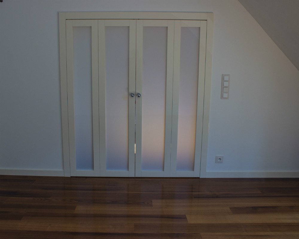 DRZWI CLASSIC C4 DWUSKRZYDŁOWE - OŚCIEŻNICA STANDRAD 80MM - KOLOR RAL 9010 POŁYSK- SZYBA STAYNOWANA - ZAWIASY CHOWANE - SYSTEM DRZWI SKŁADANYCH PODWÓJNYCH