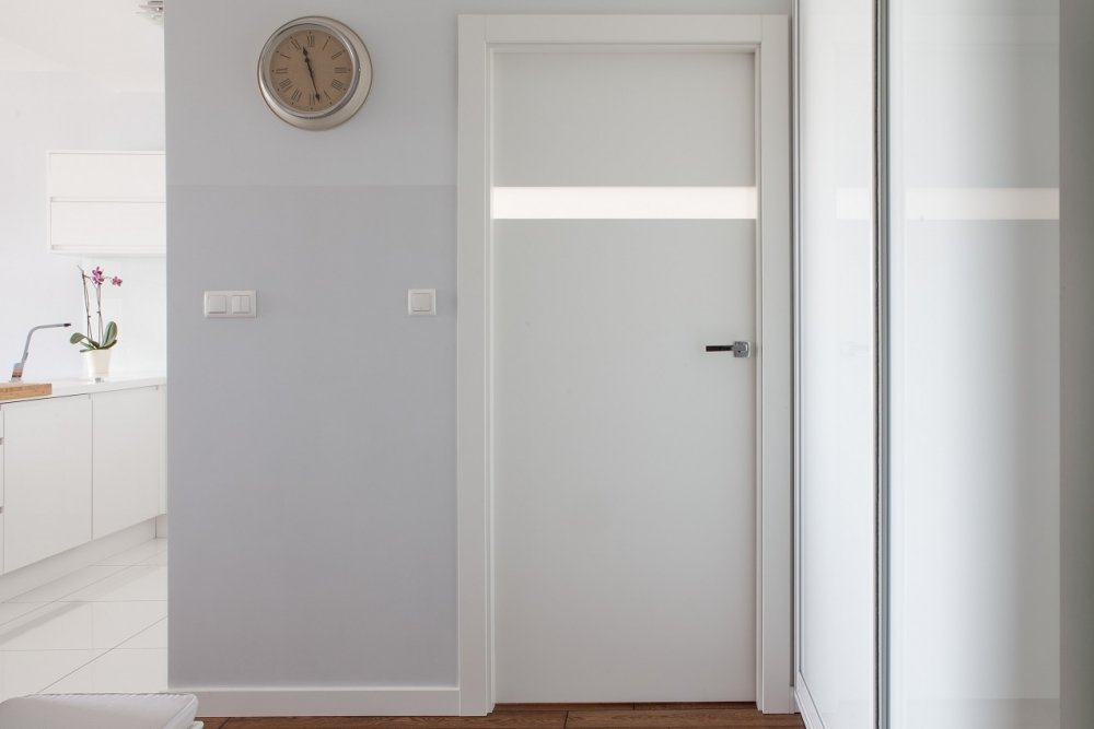 DRZWI HORYZONT H3 - OŚCIEŻNICA STANDARD 80MM - KOLOR BIAŁY RAL 9003 - SZYBA MLECZNA BEZPIECZNA - ZAWIASY CHOWANE