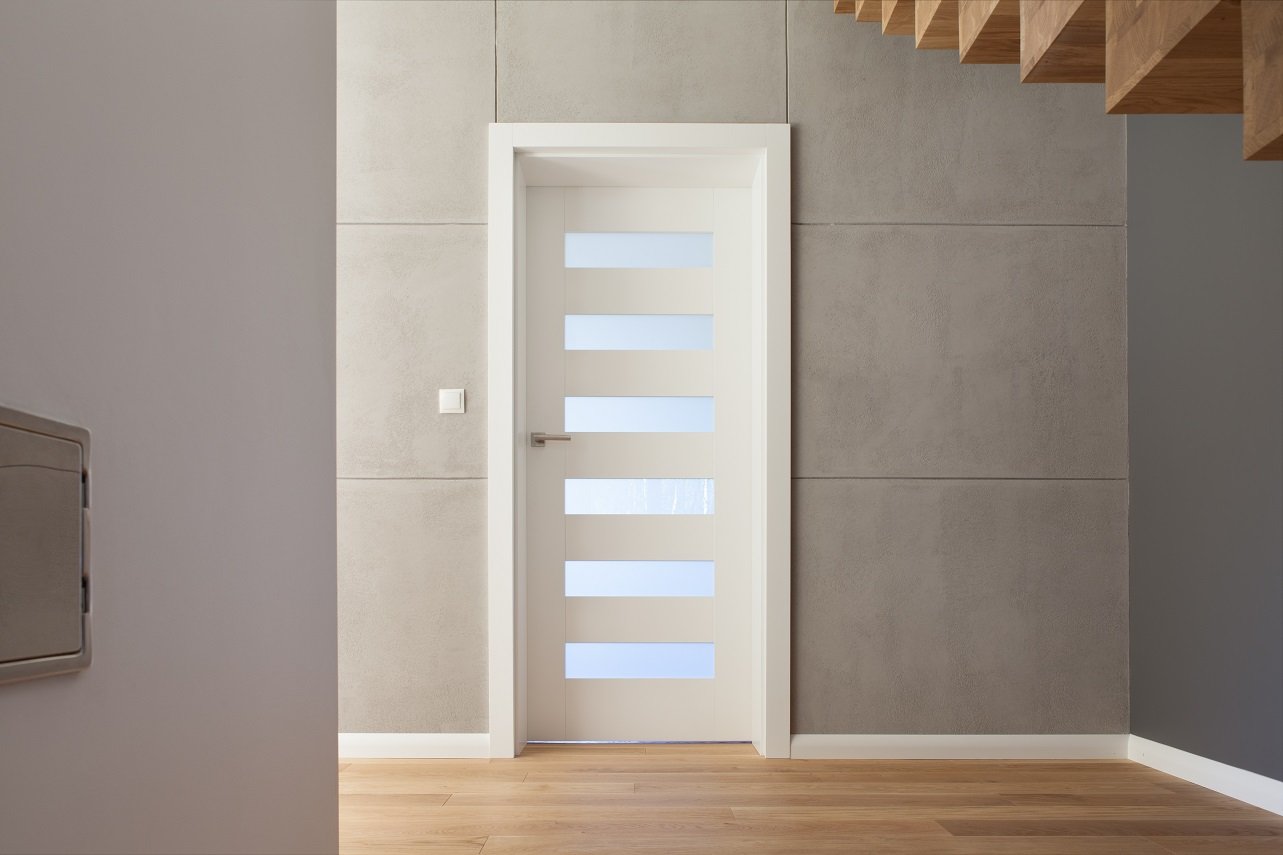 DRZWI KOMFORT K1 - SZKŁO MLECZNE BEZPIECZNE - KOLOR BIAŁY RAL 9003 - OŚCIEŻNICA STANDARD 80MM - ZAWIASY CHOWANE