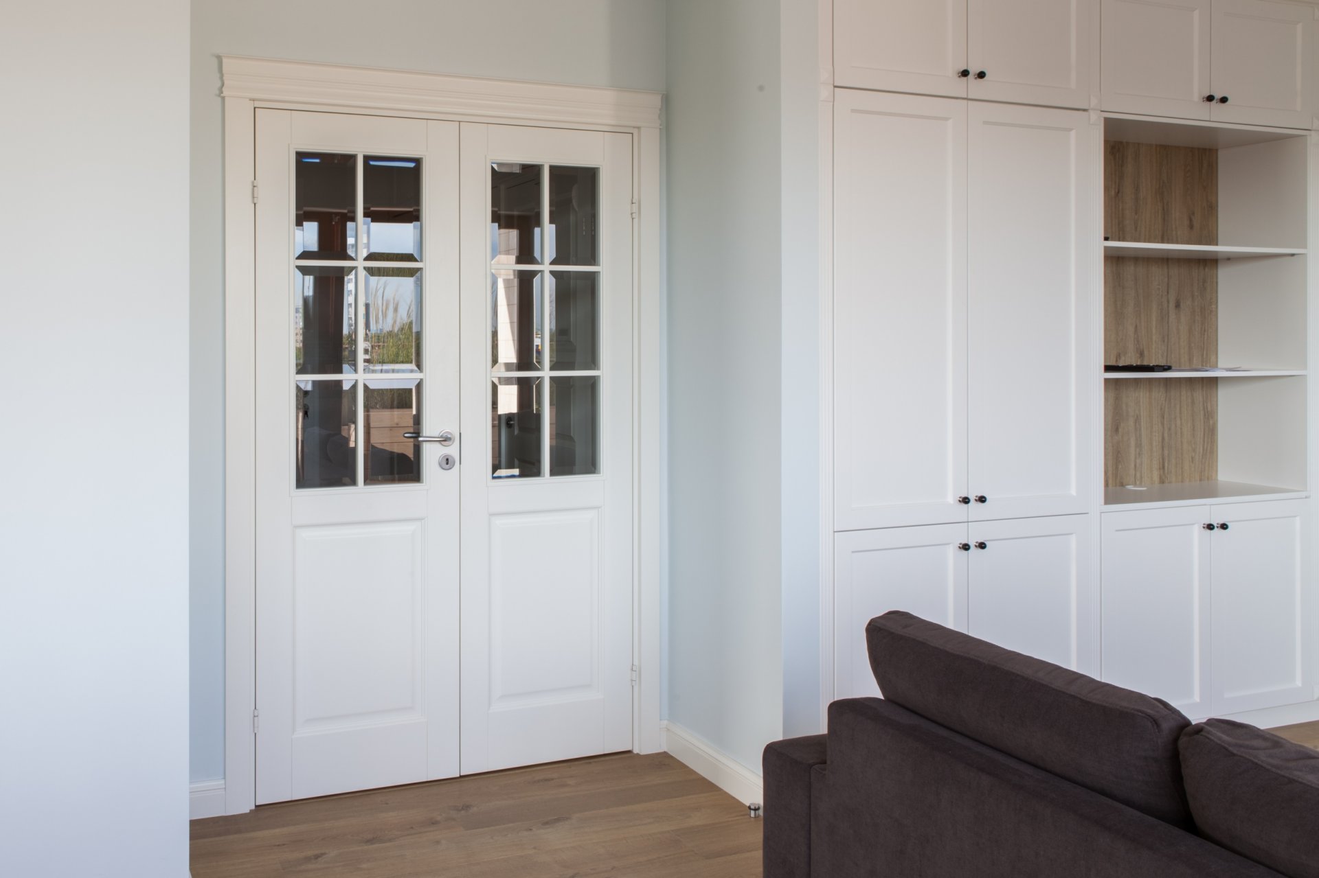 DRZWI KUNGSATER 532 DWUSKRZYDŁOWE - OŚCIEŻNICA REGULOWANA - OPASKI PŁASKIE 70MM- KORONA MODEL 1.5 - KOLOR NCS 0-502Y - ZAWIASY WIDOCZNE - SZYBA BEZBARWNA PRZEZROCZYSTA FAZOWANA