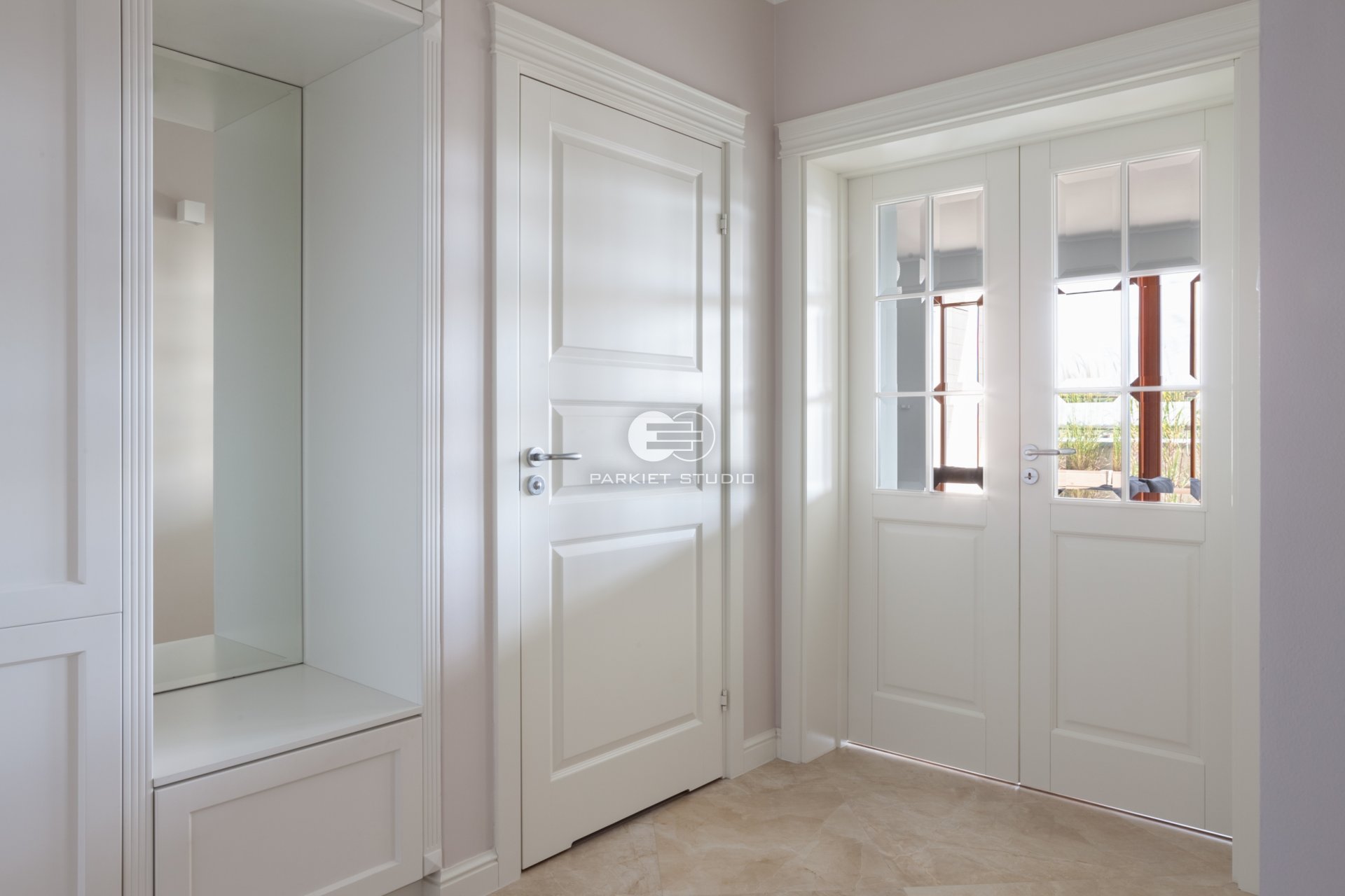 DRZWI - Z LEWEJ STYLE 03 Z PODCIĘCIEM ŁAZIENKOWYM - Z PRAWEJ DRZWI KUNGSATER 532 DWUSKRZYDŁOWE - OŚCIEŻNICA REGULOWANA - OPASKI PŁASKIE 70MM- KORONA MODEL 1.5 - KOLOR NCS 0-502Y - ZAWIASY WIDOCZNE