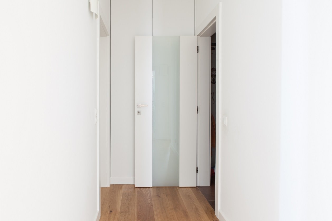 DRZWI VERTICAL V2 Z SZYBĄ MLECZNĄ BEZPIECZNĄ-OŚCIEŻNICA STANDARD 80MM-KOLOR BIAŁY RAL 9003-ZAWIASY CHOWANE